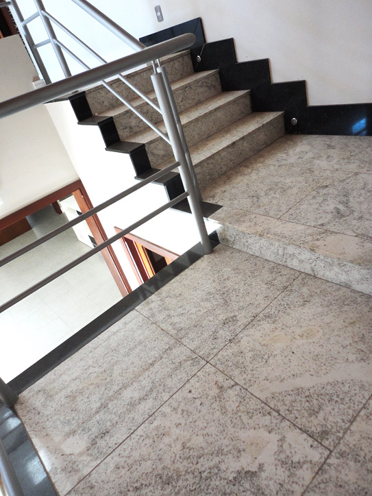 Escada revestida em Granito Branco Dallas e laterais em Granito Preto Sao Gabriel