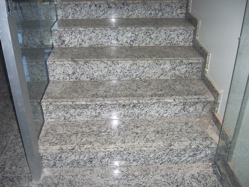 Escada revestida em Granito Branco Dallas e laterais em Granito Preto Sao Gabriel